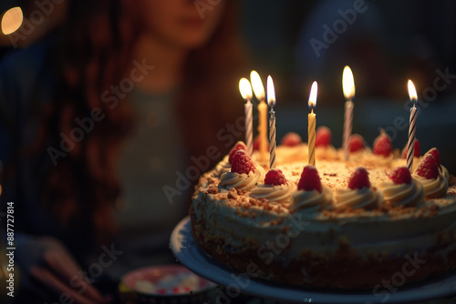 © Tetiana, Fototapeta premium Birthday party with beautiful tasty cake and candles, full family kids pets friends, Generative AI