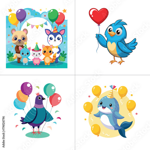 Fototapeta premium Birthday postcard with bird and air balloon.