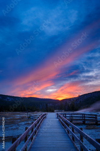 Naklejka premium Biscuit basin walkway with blue steamy water and beautiful colorful sunset. Yellowstone, Wyoming, USA