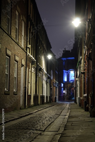 Fototapeta premium Bishop Lane, Old Town, Hull, looking west, by night.