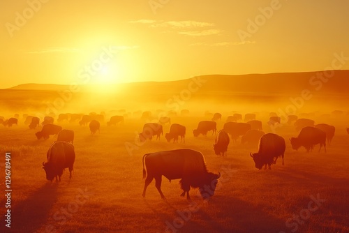 © mohdfaizal, Naklejka premium Bison Grazing at Sunrise in a Misty Prairie Landscape