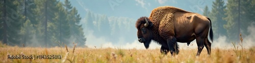 © Pawina, Fototapeta premium Bison's shaggy coat blends into misty yellowstone forest landscape, wildlife, bison