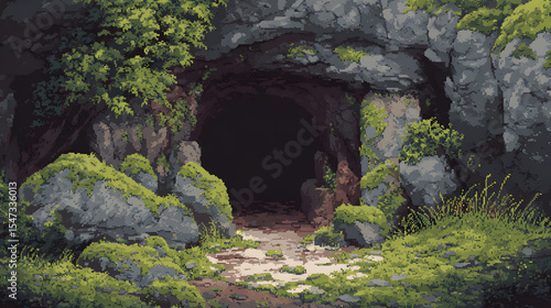 Fototapeta premium 8-bit Cave Entrance with Rocks and Moss