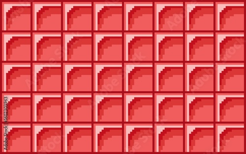 Naklejka premium 8-bit pixel art background featuring a seamless pattern of red and pink striped blocks, creating a dynamic, abstract floor texture. Ideal for retro game designs, background and digital art projects.