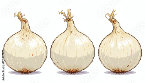 © Tomsdoingstuff, Obraz premium 8-Bit Pixelated White Onion with Peeling Outer Skin – Top-Down, Side, and Angled Views – Retro Pixel Art – Isolated on White Background – Classic Pixel Onion Illustration