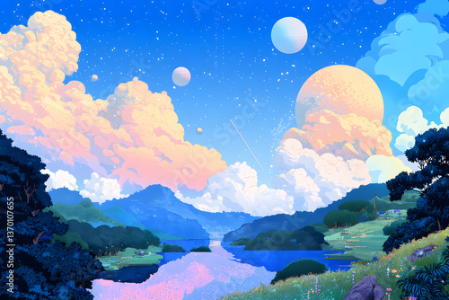 © Luluraschi, Fototapeta premium 8-bit wallpaper art of quantum computing landscape with pixel-designed information manipulation techniques