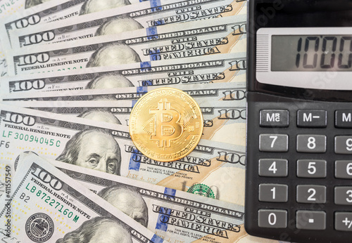 © Tania, Fototapeta premium bitcoin and calculator on the background of dollars. Gold coin Bitcoin.
