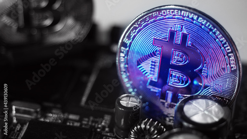 Fototapeta premium Bitcoin and semiconductor. Represent mining in Cryptocurrency cause global warming. Bitcoins on CPU board. Close-up Bitcoin with blue and pink light. circuit board with coin. Online asset concept.