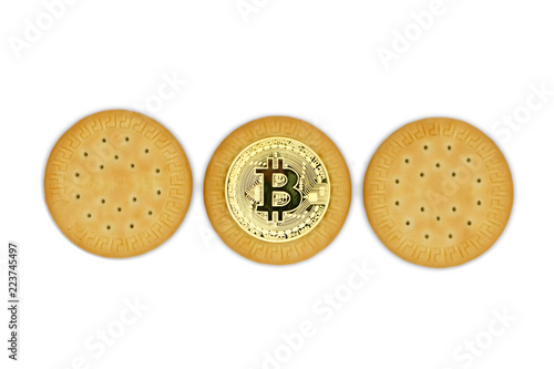 © ILIA, Fototapeta premium bitcoin and three cookies close-up, isolated