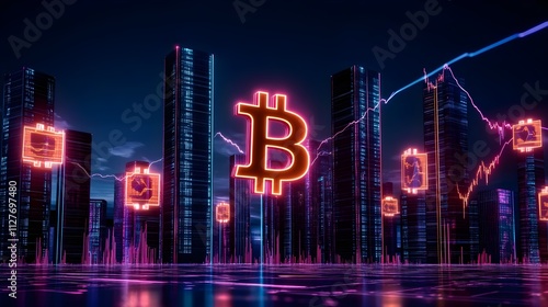 Naklejka premium Bitcoin Cityscape Neon Lights