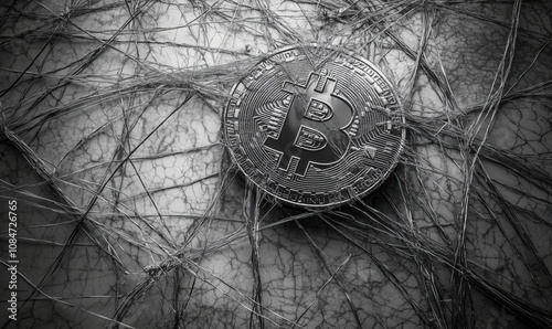 Naklejka premium Bitcoin coin entangled in fibers, digital currency concept, black and white image, intricate details, modern finance, technology