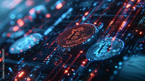 © Ajay, Fototapeta premium Bitcoin crypto currency on circuit board. Finance and money concept.
