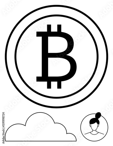 Obraz premium Bitcoin currency logo inside a circle, cloud icon, and user profile outline....