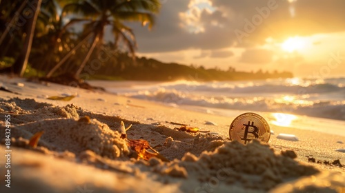 © BlackBird Studio, Obraz premium Bitcoin in beach sand at sunset