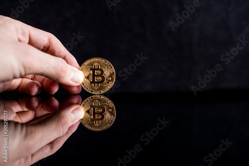 Fototapeta premium bitcoin in hand on a black background. Mirror reflection of a coin