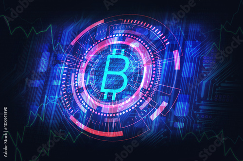© Sergey, Obraz premium bitcoin mining cryptocurrency concept in red blue dark style, earning cryptocurrency, digital, electronic money. 3D illustration