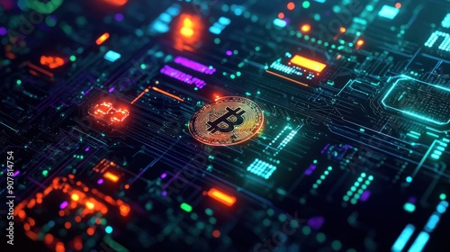 © Mioabang, Obraz premium Bitcoin on a Circuit Board