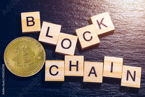 © daliu, Obraz premium Bitcoins money Virtual currency concept background. Golden bitcoin coin blockchain technology for crypto currency. Digital money currency. Small wooden blocks with block chain text on them.