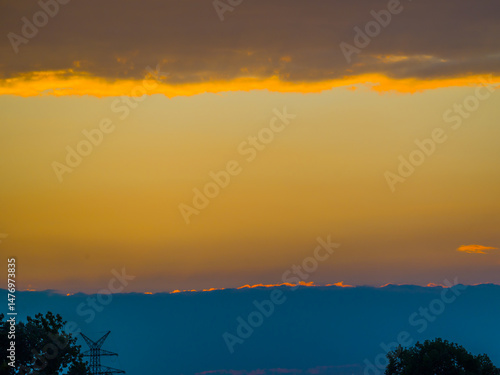 © Gabdulvachit, Fototapeta premium Bizarre colorful parallel sky clouds at sunset