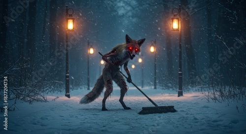 © Ariestia, Fototapeta premium Bizarre, menacing creature with glowing eyes sweeps snow on a dark, lamp-lit winter path
