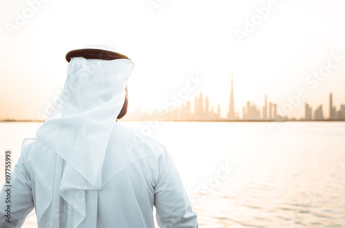 Obraz premium biznesmen w dubaju w czasie zachodu słońca