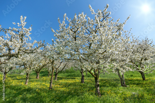 © Robert Schneider, Fototapeta premium Blühende Kirschbäume in einem Obstgarten