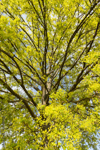 Obraz premium Blühender Spitzahorn (Acer platanoides) im Frühjahr