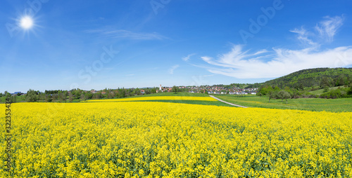 © Robert Schneider, Obraz premium Blühendes Rapsfeld in sonniger ländlicher Landschaft mit Dorf - Panorama
