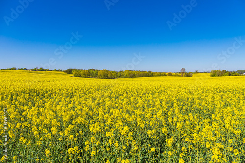 © Rico Ködder, Obraz premium Blühendes Rapsfeld und Bäume im Frühling bei Sildemow