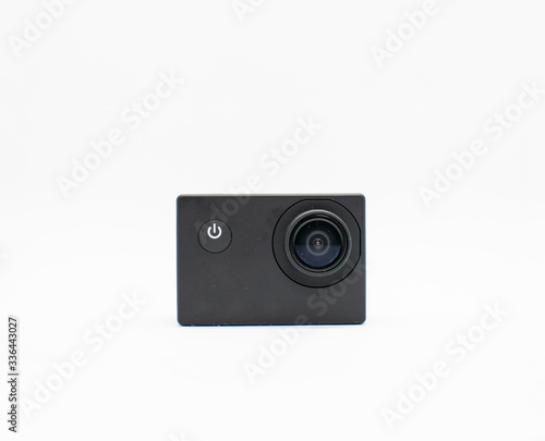 © Lazaros, Fototapeta premium Black action camera isolated on white background.