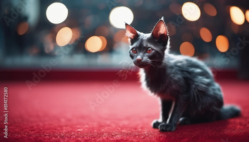 © astaszczyk, Fototapeta premium Black adorable lykoi cat on the red carpet. Close up.
