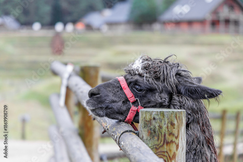 Obraz premium Black Alpaca Profile at Wooden Fence