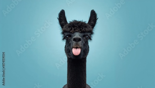 Fototapeta premium Black alpaca with tongue out, highlighting humorous expression, World Animal Day