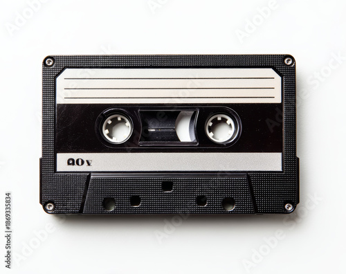 Obraz premium Black analog cassette tape with textured plastic casing and metallic reels,...