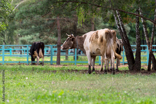 © Hanna Aibetova, Fototapeta premium Black and Brown Cows are feeding on a Livestock Farm.