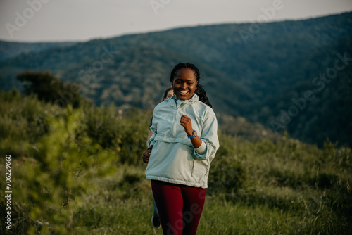 © La Famiglia, Obraz premium Black and Caucasian women jogging side by side, syncing smartwatches