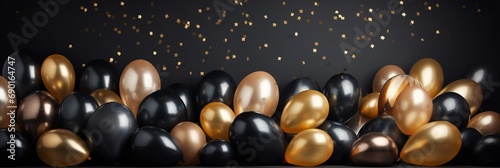 Naklejka premium Black and Gold Balloons with Confetti - Celebrate with a Festive Background and Banner for Text