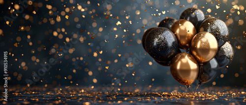 Fototapeta premium Black and Gold Balloons with Confetti Celebration Background