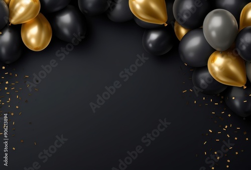 © Riz, Naklejka premium Black and Gold Balloons with Confetti on a Dark Background