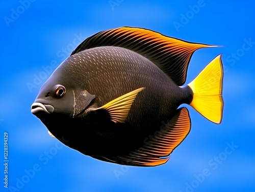 © Siasart Studio, Naklejka premium Black and gold fish swims gracefully in crystal-clear blue water, vibrant marine life underwater.