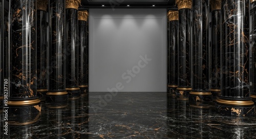 Fototapeta premium Black and gold marble interior complemented by towering grand columns