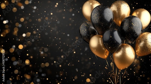 Naklejka premium Black and Golden Balloons with Sparkles on Dark Background