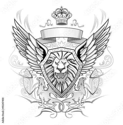 © Abrams, Fototapeta premium Black and Gray Emblem of mystery roaring winged lion on shield