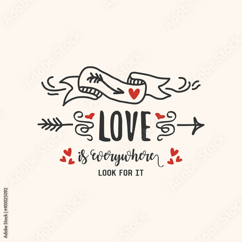 © Pelikanz, Fototapeta premium Black and red abstract hand drawn LOVE is everywhere ribbon, hearts, and arrows icons on pink background