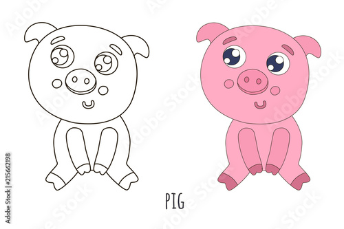 © Svetlana, Naklejka premium Black and white and colored cute pig vector illustration. Coloring page