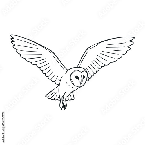 Naklejka premium Black and white barn owl line drawing with outstretched wings on white...
