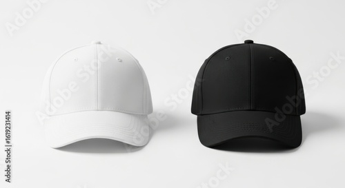 © Tika, Fototapeta premium Black and White Baseball Caps on White Surface in Minimalist Style