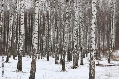 Fototapeta premium Black and white birch trees with birch bark in birch forest among other birches in winter in snow