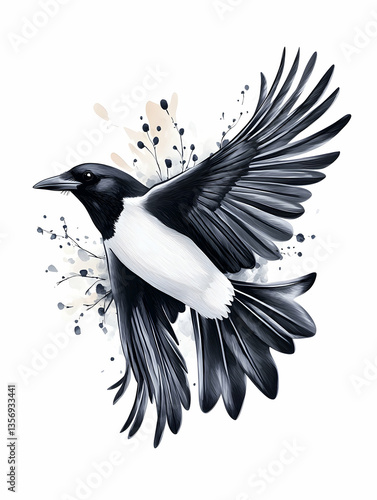 © Supriyono, Obraz premium Black and white bird in flight, watercolor style, floral background