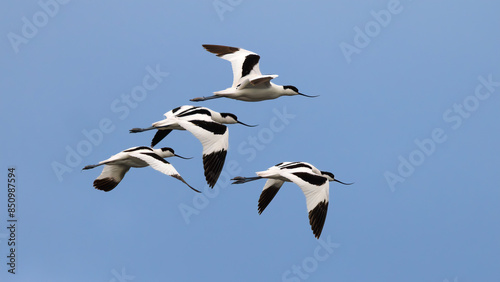 © Soner, Obraz premium 4 black and white birds (avocet) flying in a formation on a blue sky backgropund